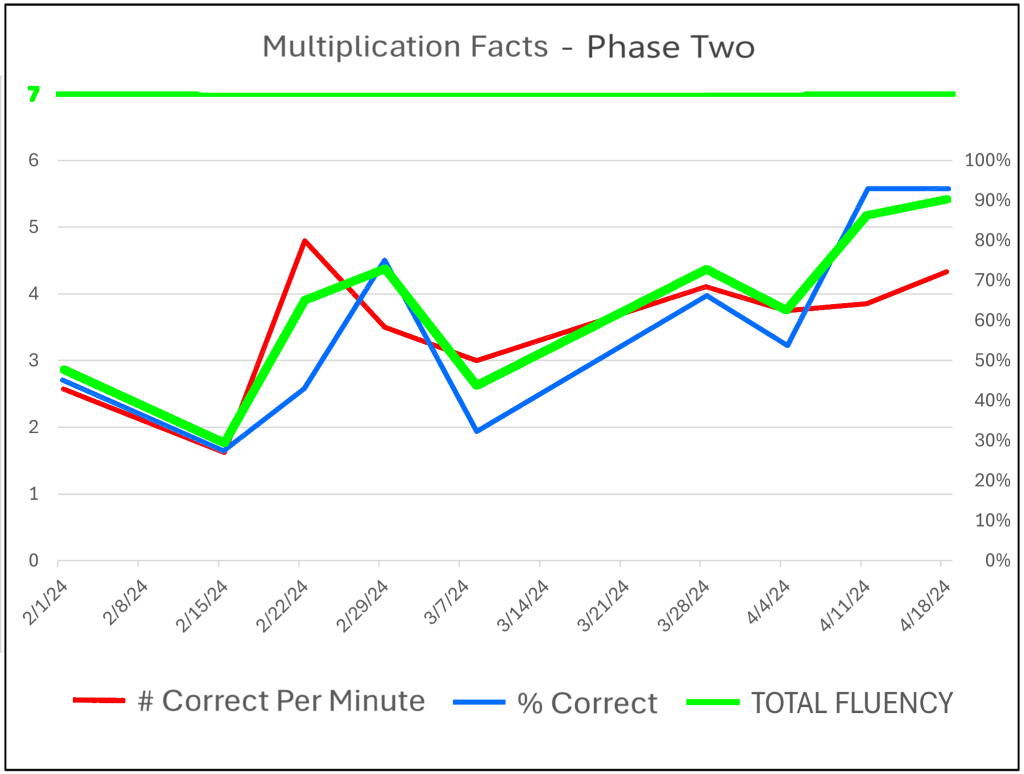 Progress monitoring is an important component of working with a student. Below is an example of progress monitoring for multiplication facts fluency.